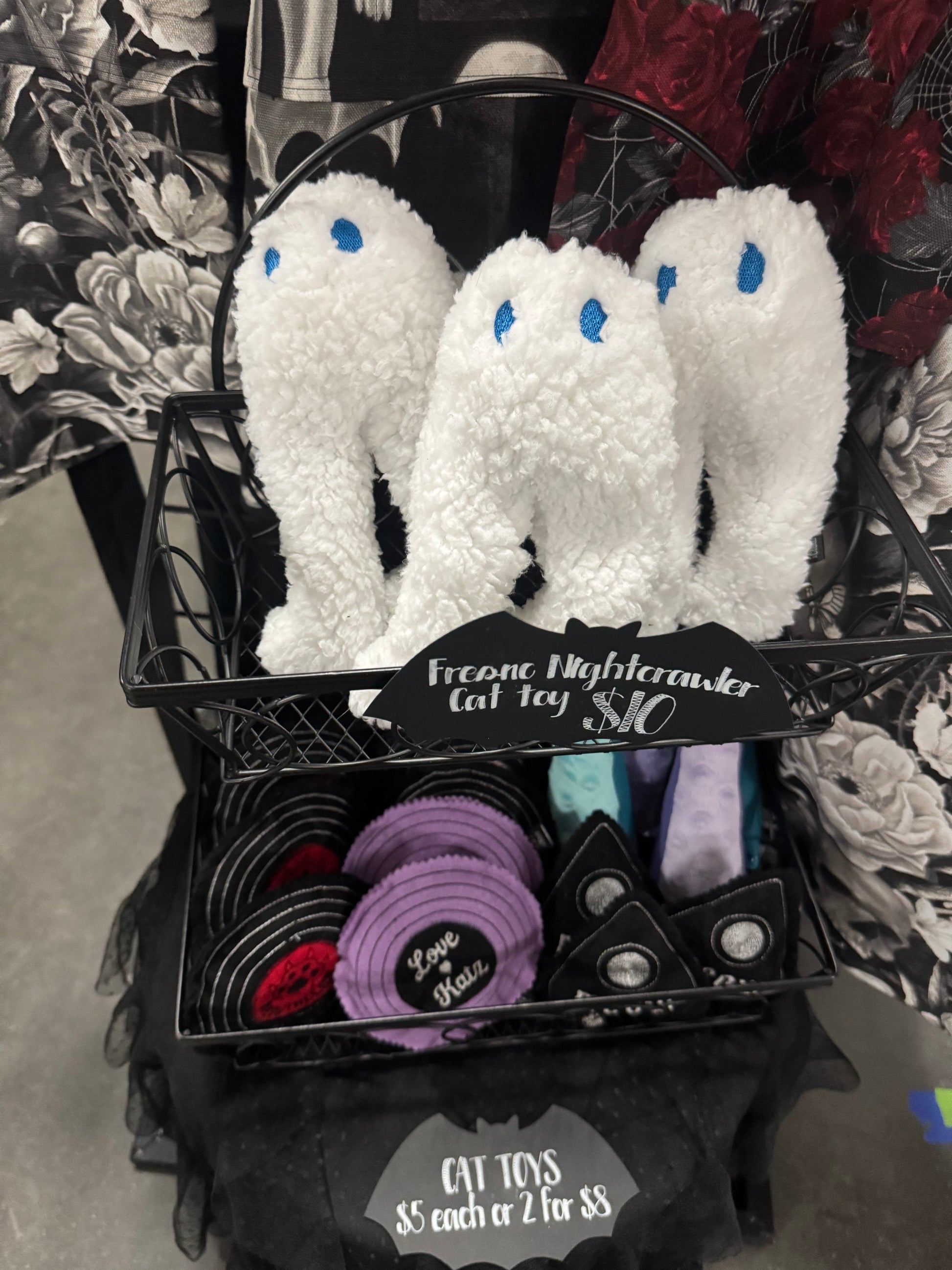 Made of extra soft sherpa and filled with a catnip and silvervine blend and a jingle bell in each foot and floppy legs, these little guys are perfect for snuggling with your familliar.
